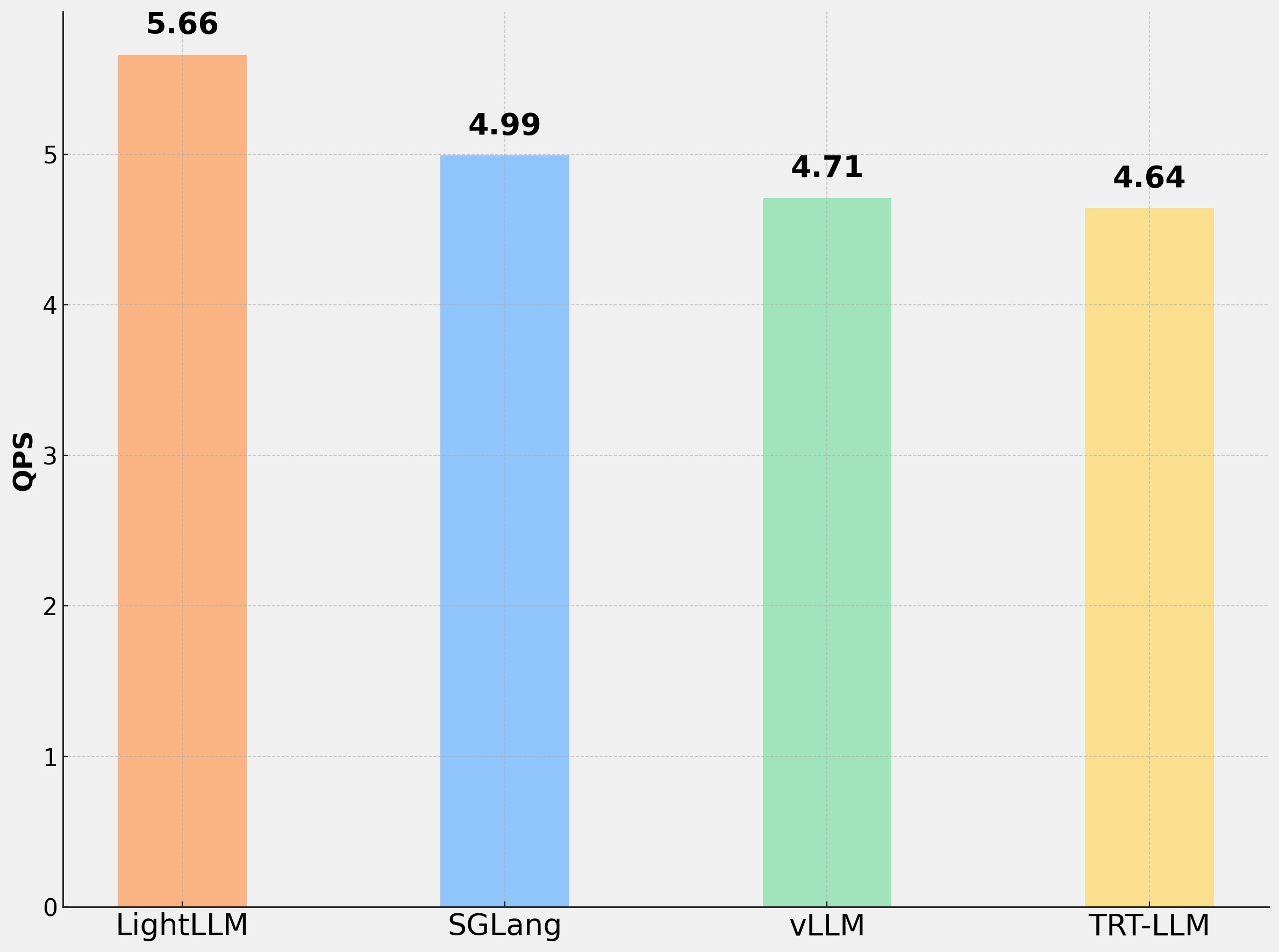 The figure below shows the performance comparison of LightLLM, sglang==0.4.3, vllm==0.7.2, and trtllm==0.17.0 on a single H200 machine, using DeepSeek-R1 (num_clients = 100). The input length of the test data is 1024, and the output follows a Gaussian distribution with a mean of 128. LightLLM achieves better performance.