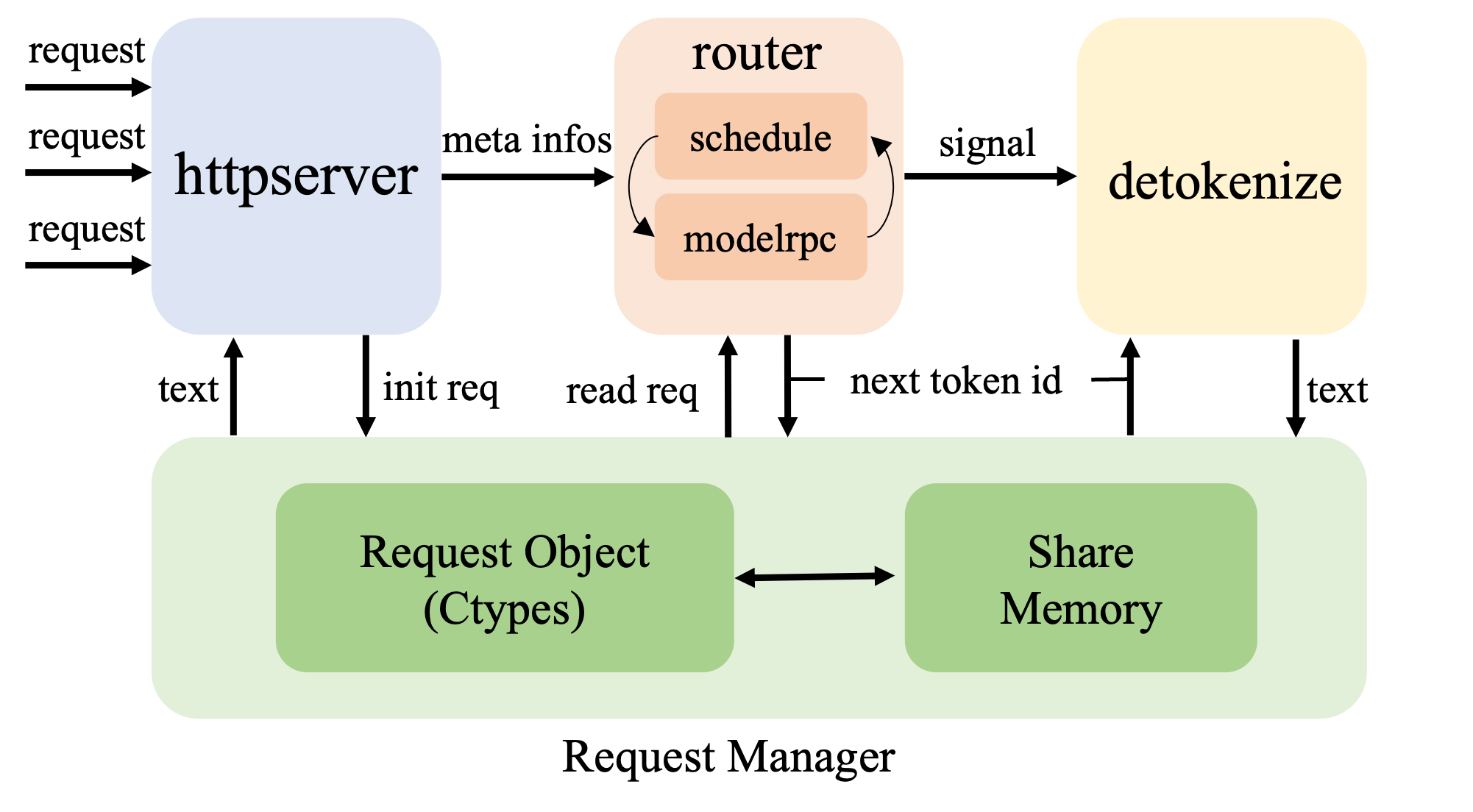 The new framework of LightLLM is shown in the figure below. We have retained the previous three-process architecture design and designed a request object that can be accessed across processes via ctypes. We store the metadata of the requests in shared memory, ensuring that only a minimal amount of necessary data is communicated between processes. Additionally, we have implemented the folding of scheduling and model inference, and have nearly eliminated the communication overhead between the scheduler and model-rpc in the previous version of the router. We implemented the CacheTensorManager class, which takes over the allocation and release of Torch tensors within the framework. This maximizes the cross-layer sharing of tensors at runtime, as well as memory sharing between different CUDA graphs. On an 8x80GB H100 machine, with the DeepSeek-v2 model, LightLLM can run 200 CUDA graphs concurrently without running out of memory (OOM). We will subsequently publish a series of blog posts introducing the architecture of LightLLM.