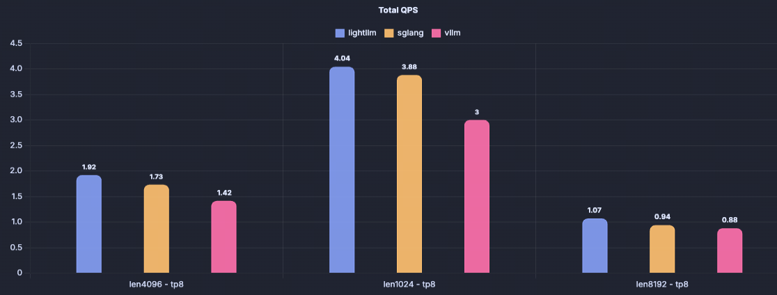 We validated both tensor parallel (TP) and data parallel (DP) deployment modes of the DeepSeek-671B model on 8×H200-80G GPUs. We conducted three groups of experiments: input–output lengths of 1k–1k, 4k–1k, and 8k–1k. Each group used 200 requests at a rate of 100 QPS. The results, shown below, demonstrate that LightLLM consistently outperforms the sglang==0.5.2rc0 and vllm==0.10.1.1.