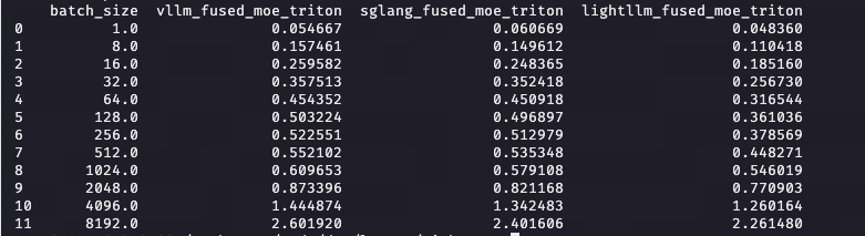 Tensor Parallel: For tensor parallelism, we performed fine-grained optimizations on our Triton MoE kernels. We introduced three MoE align Triton kernels and optimized the L2 cache usage of the group GEMM Triton kernel. Moreover, we added the transpose option into the configuration search space in order to achieve better performance. A performance comparison between our fused MoE implementation and that of sglang/vLLM is shown below.