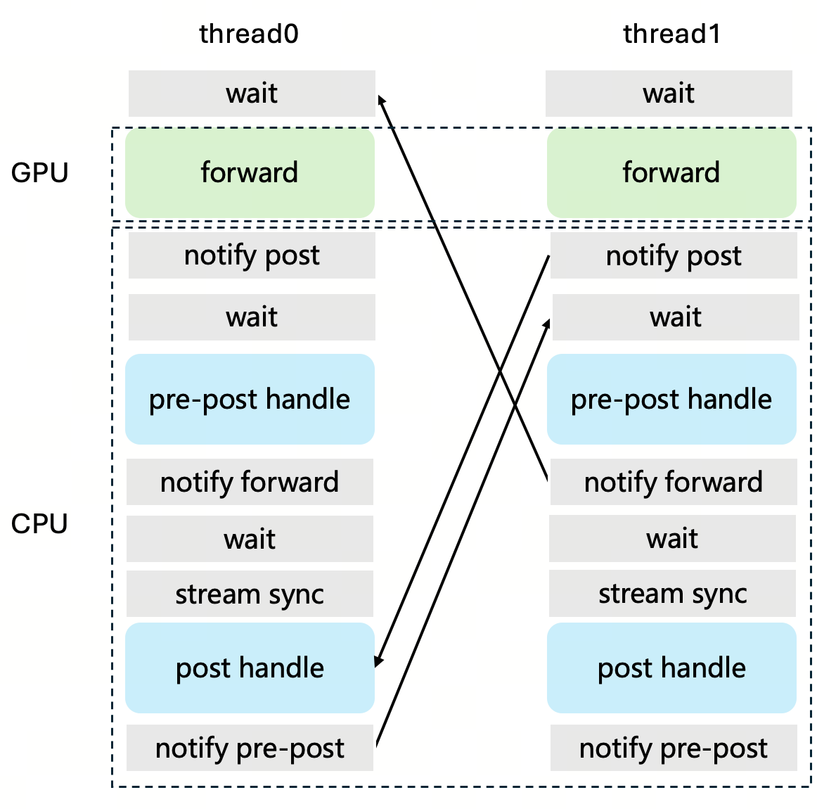 Moreover, to eliminate CPU overhead in the ModelBackend, we introduced two cooperative inference threads, which not only effectively folds the pre- and post-processing overhead of inference, but also preserved high code readability. As shown in the figure below, we achieve GPU–CPU overlap through continuous switching between two inference threads. If thread 1 has already launched the GPU forward, it will then notify thread 0 to finish the post-handling of the previous batch 0, followed by the pre-post-handling of the current batch.