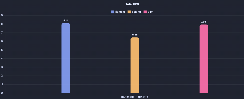 Thanks to our fully folded CPU–GPU architecture, multimodal image preprocessing can also be effectively folded, leading to improved multimodal inference performance. Below is a performance comparison of LightLLM and other frameworks on Qwen2.5-VL-72B with a single H200 GPU.